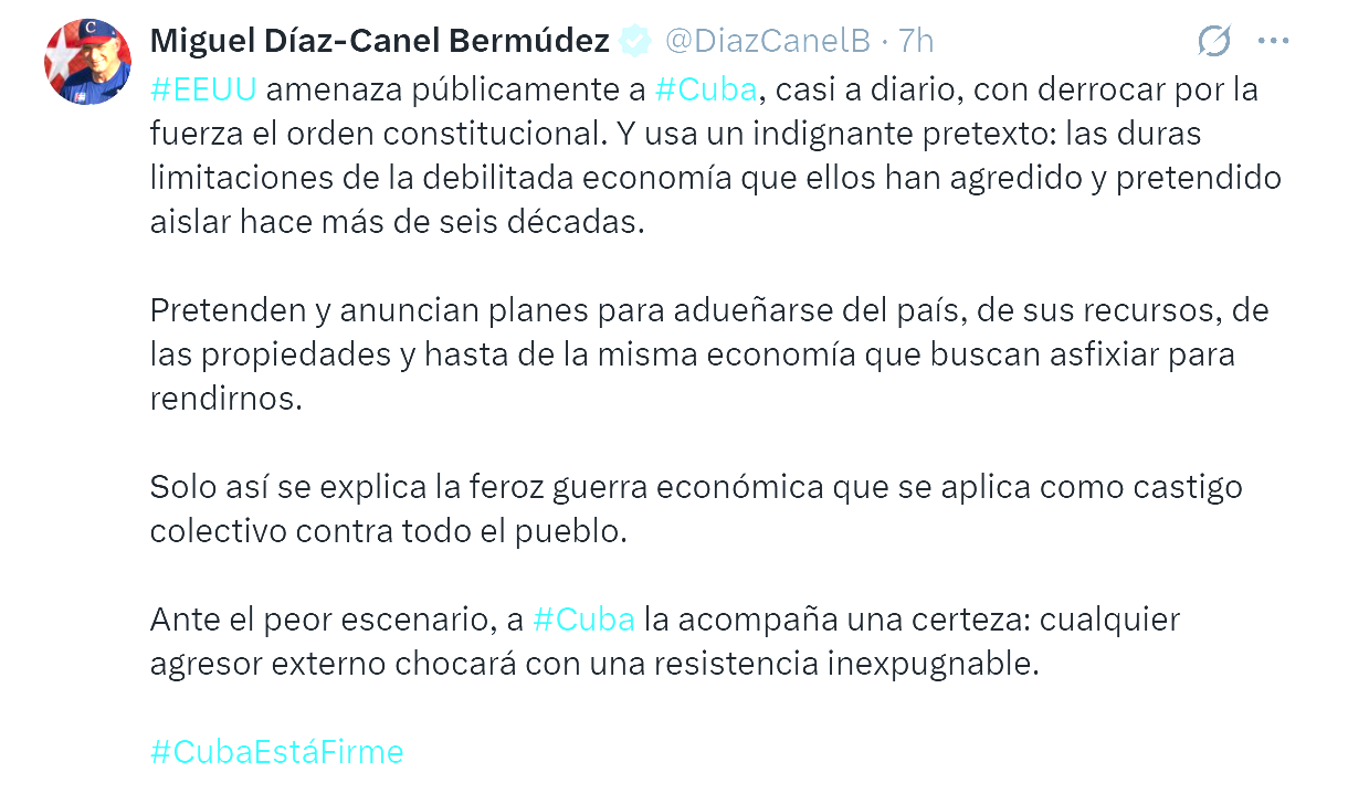 En su mensaje, Díaz-Canel afirmó que Estados Unidos utiliza la crisis interna como argumento para justificar sus acciones contra la isla.