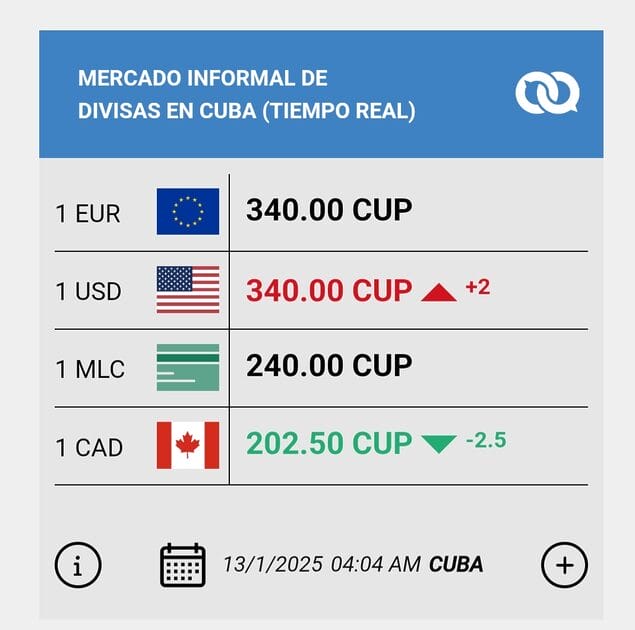 Hoy, 13 de enero de 2025, las tasas de cambio compartidas por El Toque destacan un hecho significativo en el mercado informal cubano: el dólar estadounidense y el euro alcanzaron un valor equivalente de 340 CUP.
