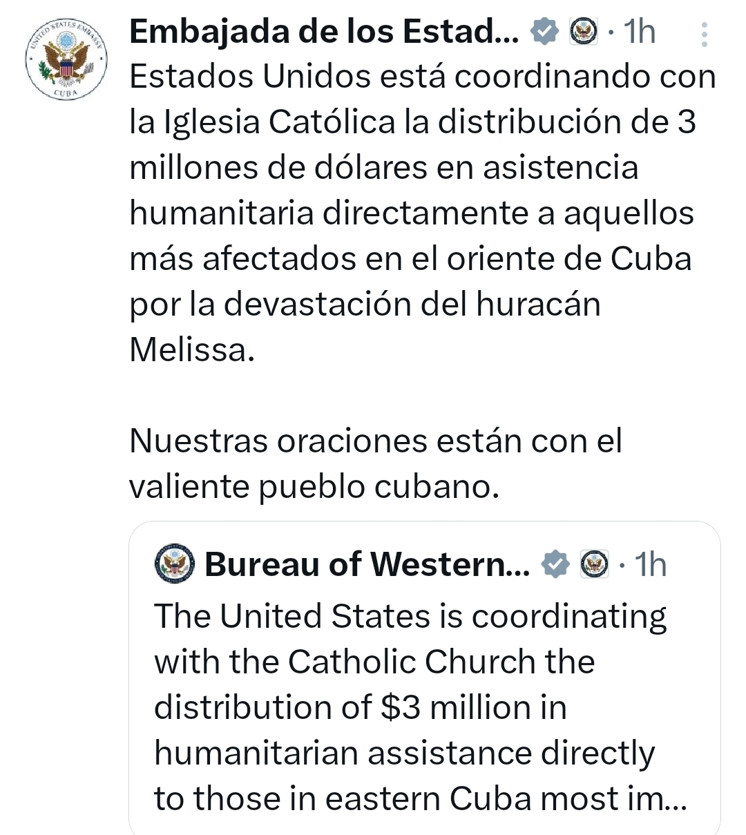 “La cooperación con la Iglesia Católica busca garantizar que la ayuda llegue rápidamente a las familias más necesitadas”, señaló la misión diplomática. Añadió además: “Nuestras oraciones están con el valiente pueblo cubano”.