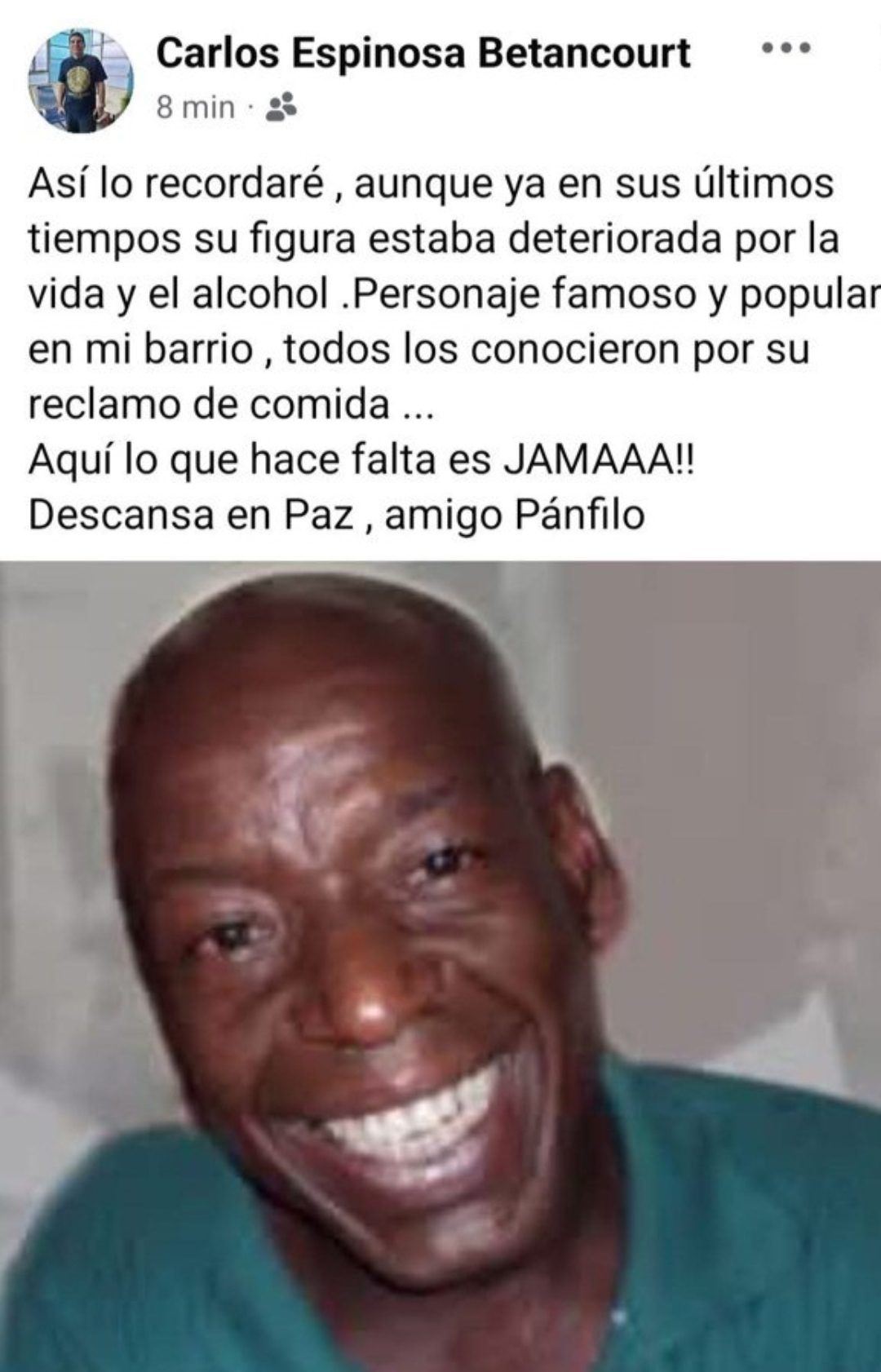 Vecinos y conocidos reaccionaron con mensajes de despedida. Carlos Espinosa Betancourt expresó: “Así lo recordaré, aunque ya en sus últimos tiempos su figura estaba deteriorada por la vida y el alcohol. Personaje famoso y popular en mi barrio, todos los conocieron por su reclamo de comida: ‘Aquí lo que hace falta es JAMAAA!!’. Descansa en Paz, amigo Pánfilo”.