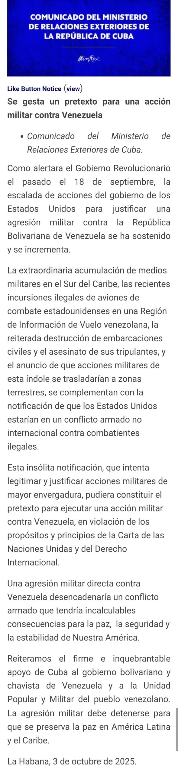 El Ministerio de Relaciones Exteriores de Cuba emitió un comunicado en el que advierte sobre el incremento de acciones por parte de Estados Unidos que, según señala, buscan crear las condiciones para justificar una intervención militar directa contra Venezuela.