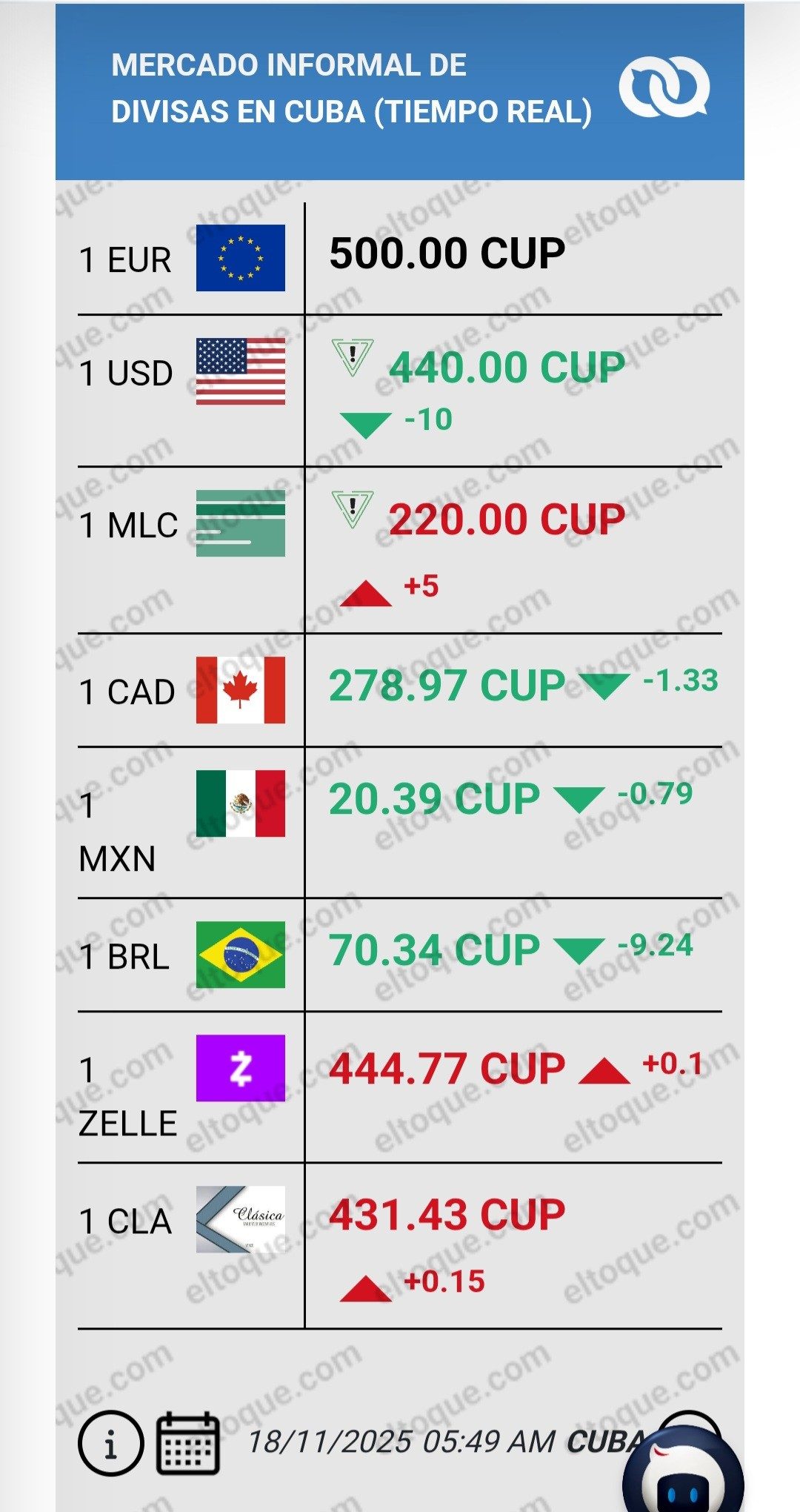 El euro se mantiene en 500 CUP, sin movimientos. La MLC sube ligeramente a 220 CUP, con un ajuste de cinco pesos al alza. El dólar canadiense desciende hasta 278.97 CUP.