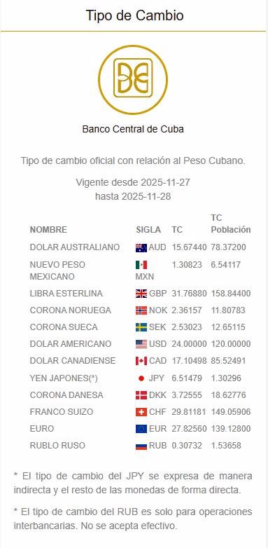 El Banco Central de Cuba mantiene hoy los siguientes valores oficiales: