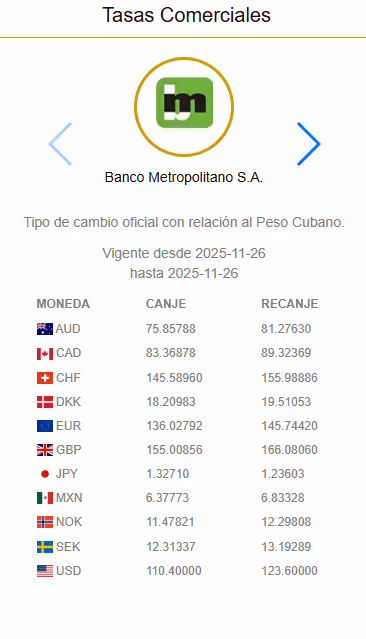 Pero además, el Banco Metropolitano publicó sus tasas comerciales de canje y recanje, que tampoco están disponibles para la población en cantidades reales: