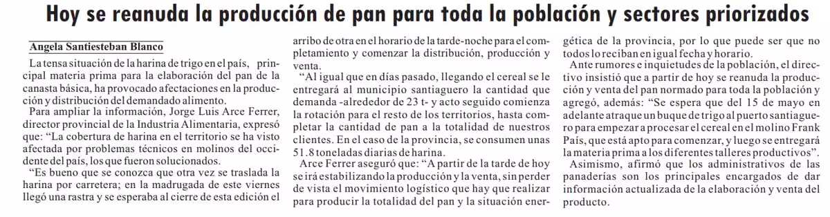 Ante los rumores, el directivo aseguró que la producción del pan normado para toda la población y sectores priorizados se restablece desde hoy. Y anunció además que “se espera que del 15 de mayo en adelante atraque un buque de trigo al puerto santiaguero para empezar a procesar el cereal en el molino Frank País. Luego, corresponde distribuirlo a los talleres productivos del territorio”.