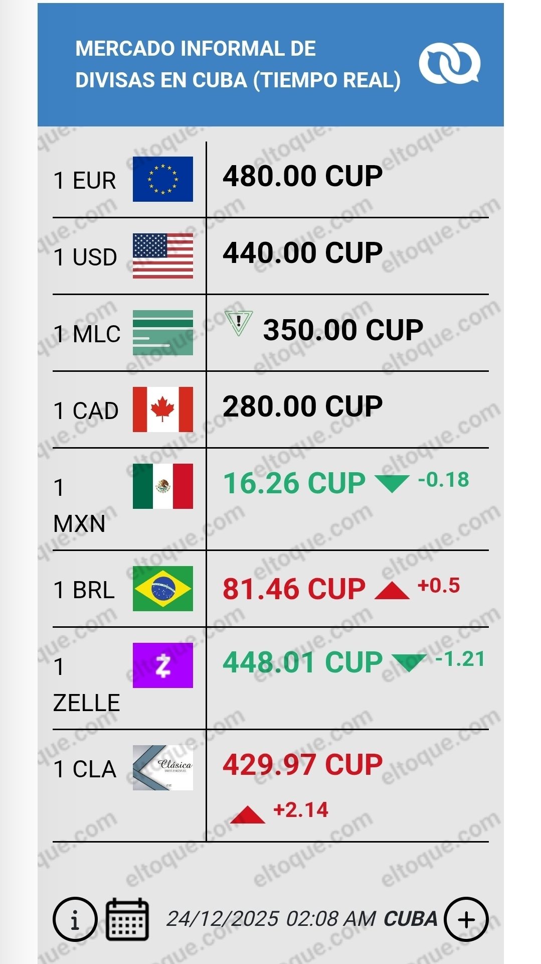 En contraste, el mercado informal mantiene el euro en 480 pesos cubanos y el dólar en 440, sin variación. Esto provoca una situación poco común: vender euros al tipo de cambio oficial genera hoy más pesos cubanos que hacerlo en el mercado informal.