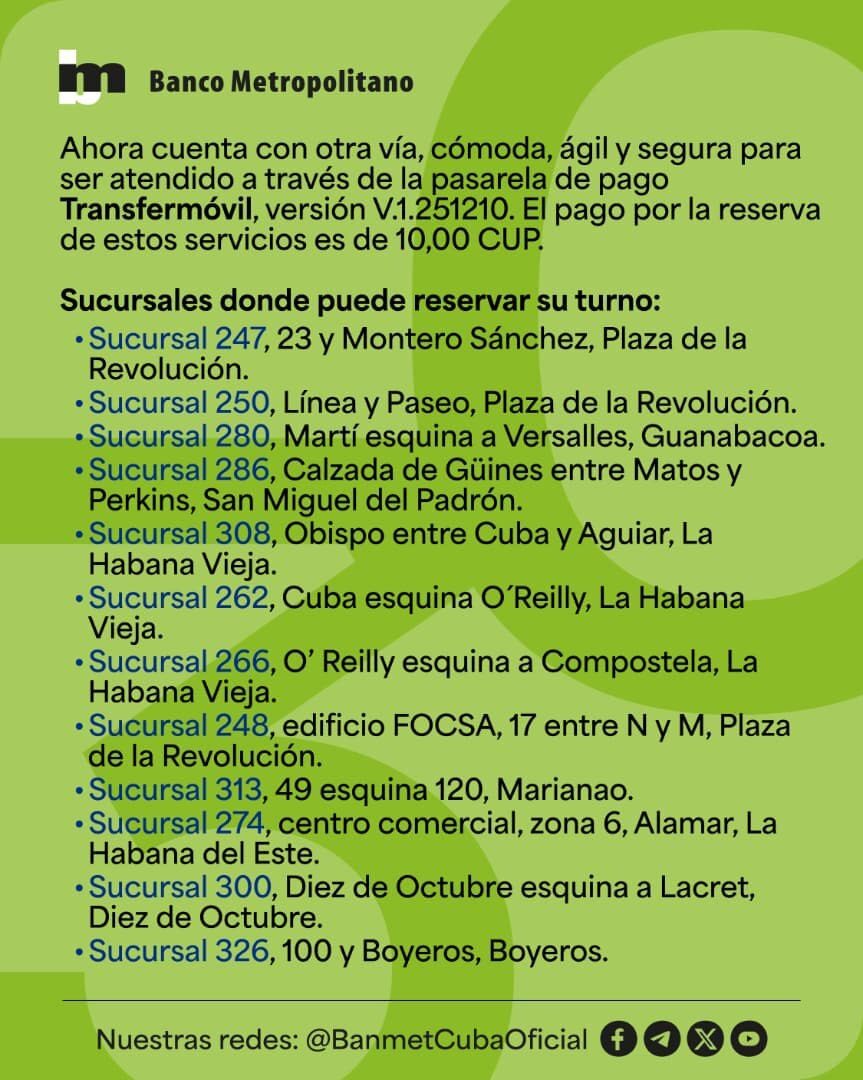El Banco Metropolitano informó que, en una primera etapa, la reserva de turnos mediante Transfermóvil está disponible en varias sucursales de La Habana. Entre ellas se encuentran oficinas ubicadas en Plaza de la Revolución, Centro Habana, La Habana Vieja, Guanabacoa, Marianao, Habana del Este, Diez de Octubre y Boyeros.