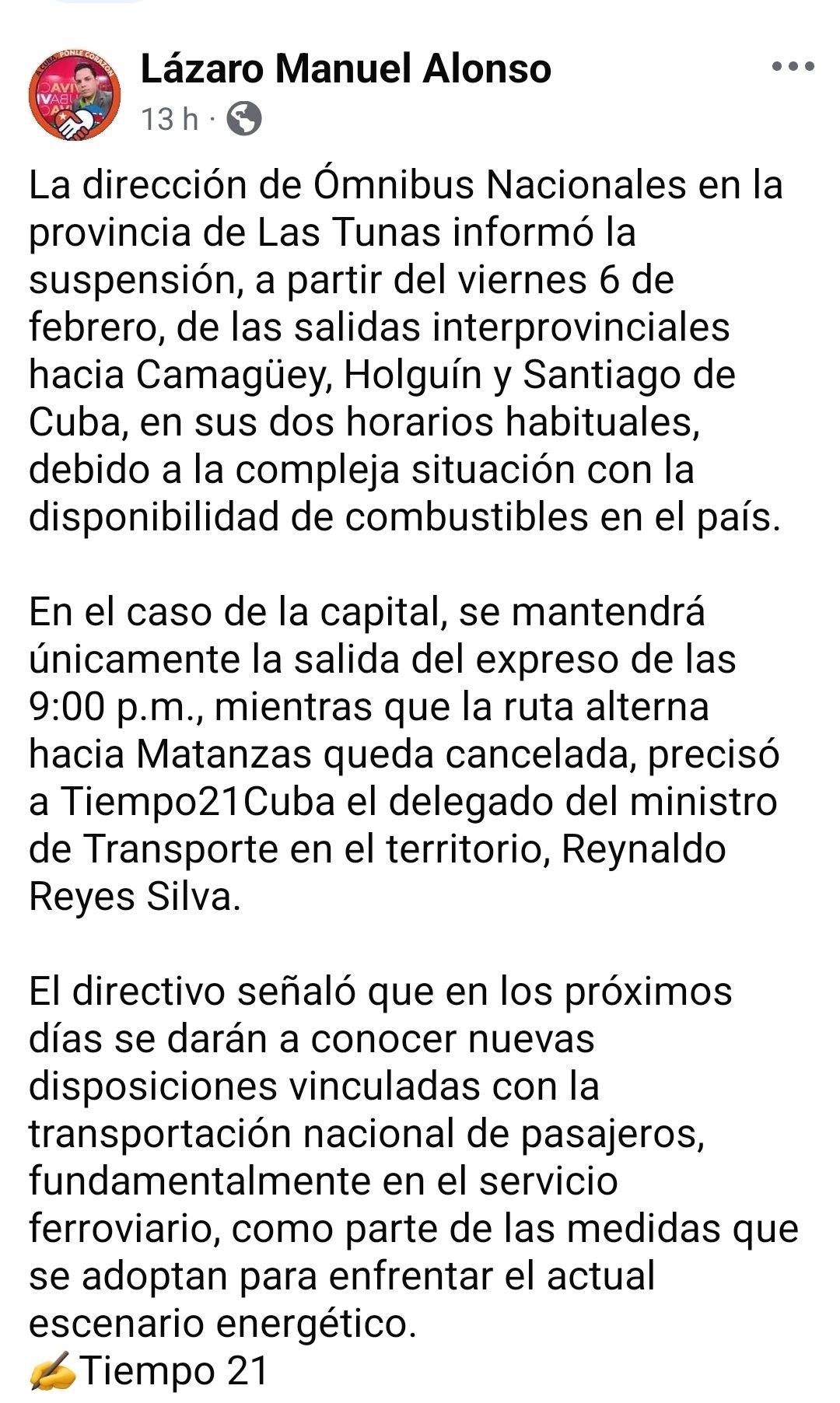 La información fue confirmada a Tiempo21Cuba por el delegado del ministro de Transporte en el territorio, Reynaldo Reyes Silva, quien explicó el alcance de las decisiones adoptadas.