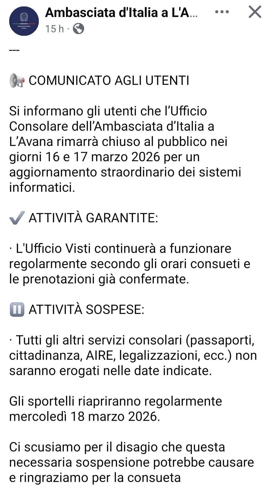 La comunicación fue difundida tanto en italiano como en español. Con ello, la sede diplomática buscó garantizar que la información llegue de forma clara a toda la comunidad interesada en los servicios consulares italianos en Cuba.