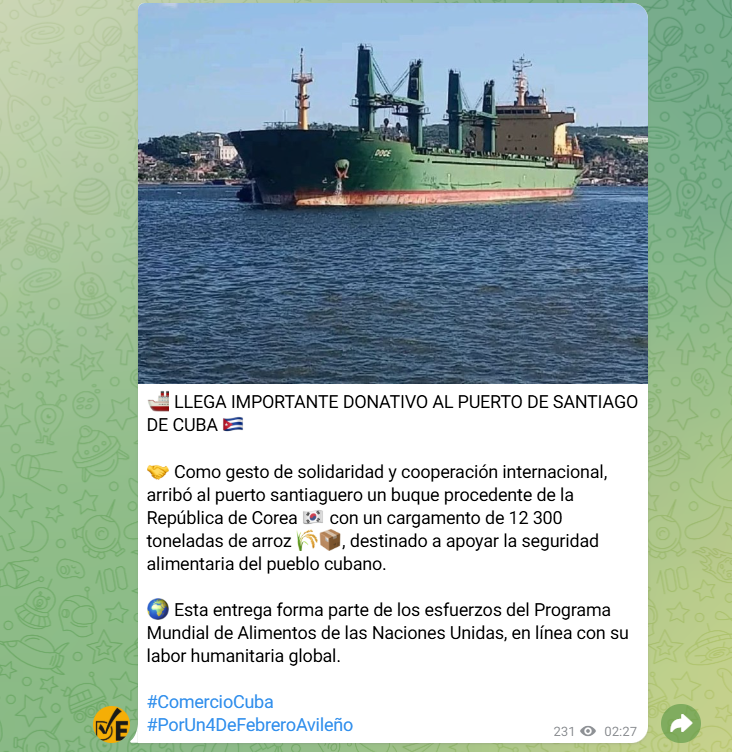 Las autoridades confirmaron el arribo a puertos cubanos de un barco con arroz de donación, destinado a apoyar la distribución en un momento marcado por atrasos prolongados.
