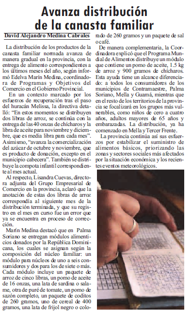 En esa provincia se inició un nuevo ciclo de entregas de la canasta familiar normada, todavía marcado por las secuelas del huracán Melissa. Las autoridades desplegaron un cronograma que combina productos pendientes con las asignaciones de final de año. La organización avanza por municipios, según disponibilidad en almacenes y transporte.