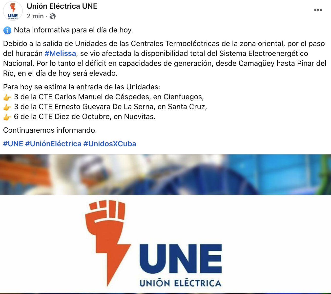 La Unión Eléctrica (UNE) informó este martes que el Sistema Electroenergético Nacional enfrenta una compleja situación. Esto se debe a la salida de varias unidades generadoras en la zona oriental del país, afectadas por el paso del huracán Melisa.