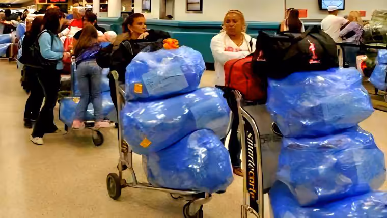 Los viajeros cubanos procedentes que vuelan hacia la isla desde Miami, Panamá y distintas ciudades del mundo popularizaron un tipo de equipajes. Llevan años recurriendo a las llamadas maletas “tipo bola”, una práctica que se ha vuelto habitual ante la escasez de artículos y la necesidad de aprovechar cada kilo permitido. Estas maletas improvisadas han sido una forma de transportar más productos sin añadir peso extra ni depender de estructuras rígidas.