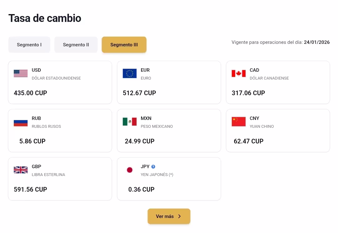 La tasa de cambio oficial en Cuba volvió a registrar variaciones este sábado 24 de enero de 2026, confirmando que la semana cerró con una presión sostenida sobre el peso cubano dentro del propio esquema del Banco Central.
