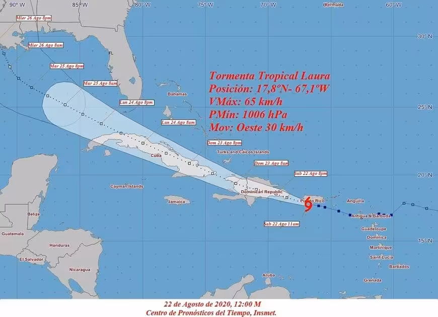 De acuerdo con la información del Centro de Pronóstico del Instituto de Meteorología sobre la Tormenta Tropical Laura, se espera que a partir del domingo 23 se produzca en la región oriental un deterioro gradual en las condiciones del tiempo con un incremento de las precipitaciones. La fuerza de los vientos y las marejadas dependerán de la evolución del evento.