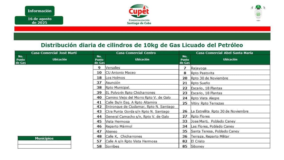 Según Cupet, entre los puntos habilitados por la Casa Comercial José Martí están Versalles, Los Holmos, Asunción, Reparto Municipal, Altamira, Ciudamar, Vista Hermosa, Chicharrones y Sorribes.
