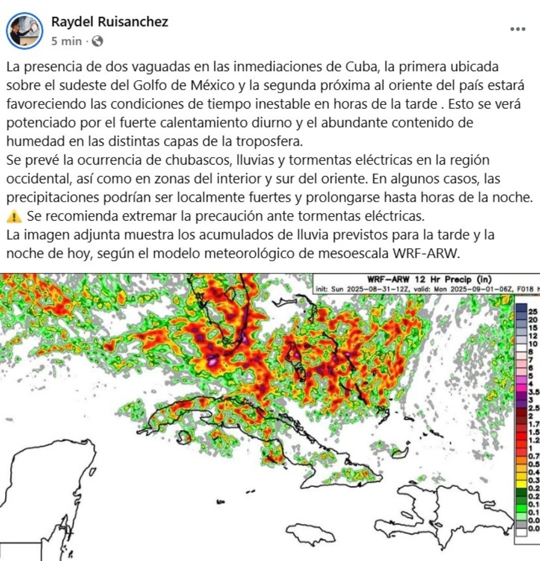 El meteorólogo Raydel Ruisánchez explicó que una vaguada se encuentra en el sudeste del Golfo de México y otra próxima al oriente cubano. La interacción de ambos sistemas, unida al fuerte calentamiento diurno y a la elevada humedad, creará condiciones favorables para lluvias intensas.