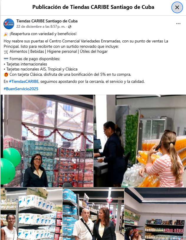 Tiendas Caribe informó en sus redes sociales la reapertura de varios establecimientos en la provincia. Entre ellos figuran el Centro Comercial Variedades Enramadas, la tienda Siglo XX y la tienda La Violeta, ubicada en el municipio de San Luis.