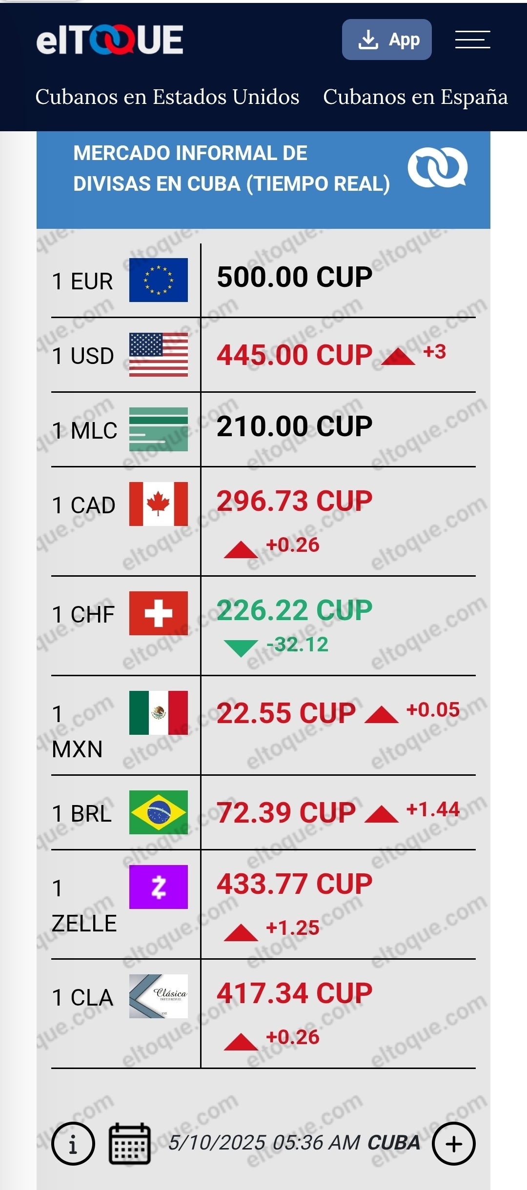 La actualización de El Toque a las 5:36 de la mañana confirma que el billete estadounidense alcanzó los 445 pesos cubanos.
