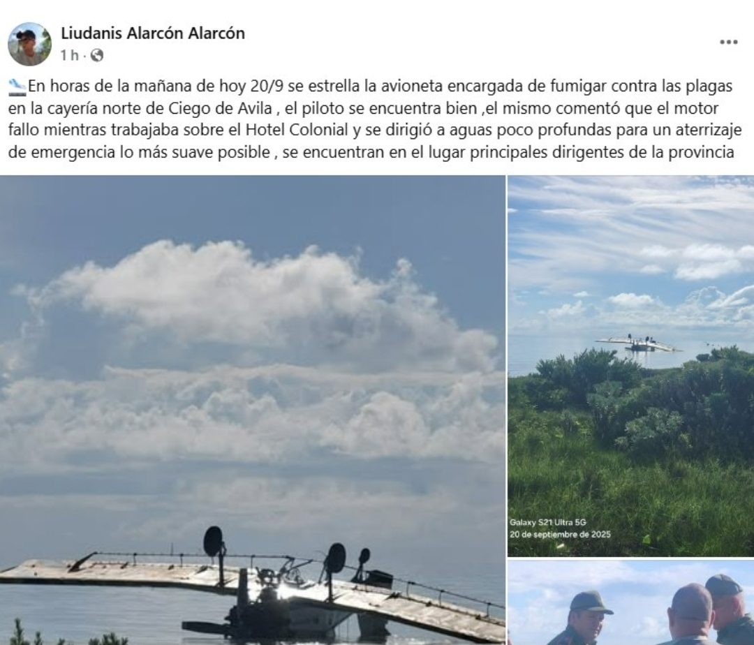 La información fue compartida en el perfil de Liudanis Alarcón Alarcón, quien señaló que el aviador se encontraba fuera de peligro luego del incidente.