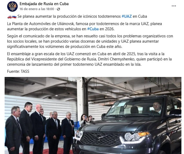 La información fue divulgada por la Embajada de Cuba en Rusia a partir de un despacho de la agencia estatal TASS. Según la nota, la empresa UAZ prevé “aumentar significativamente los volúmenes de producción” en Cuba a lo largo del año.