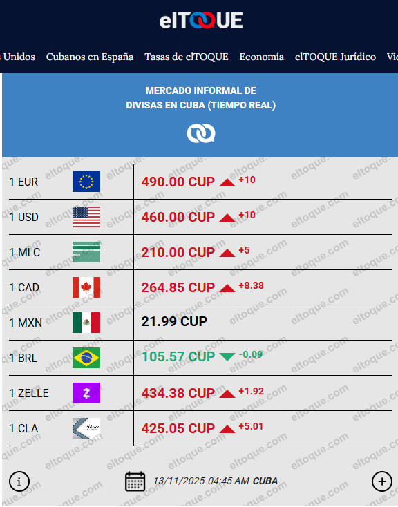 Después de varios días de relativa estabilidad y de un desplome acumulado de más de 80 pesos cubanos en apenas dos semanas, las principales divisas del mercado informal en Cuba muestran hoy una tendencia al alza, según la tasa de cambio publicada por El Toque en la madrugada de este 13 de noviembre.