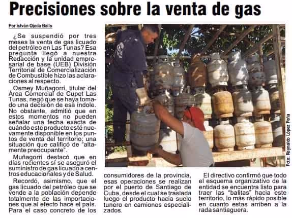 Osmey Muñagorri, titular del Área Comercial de Cupet Las Tunas, desmintió que se haya tomado una decisión formal de suspender la venta de GLP a la población por un período de tres meses. Sin embargo, reconoció que no pueden asegurar una fecha exacta para la reanudación del suministro en los puntos de venta del territorio.