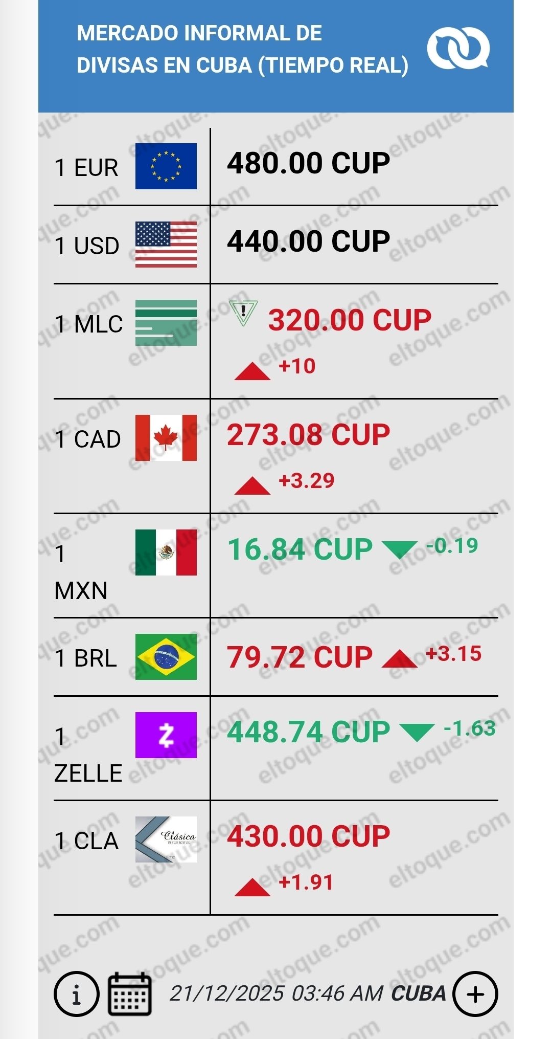 En contraste, el mercado informal de divisas mantiene el dólar estadounidense en 440 pesos cubanos.