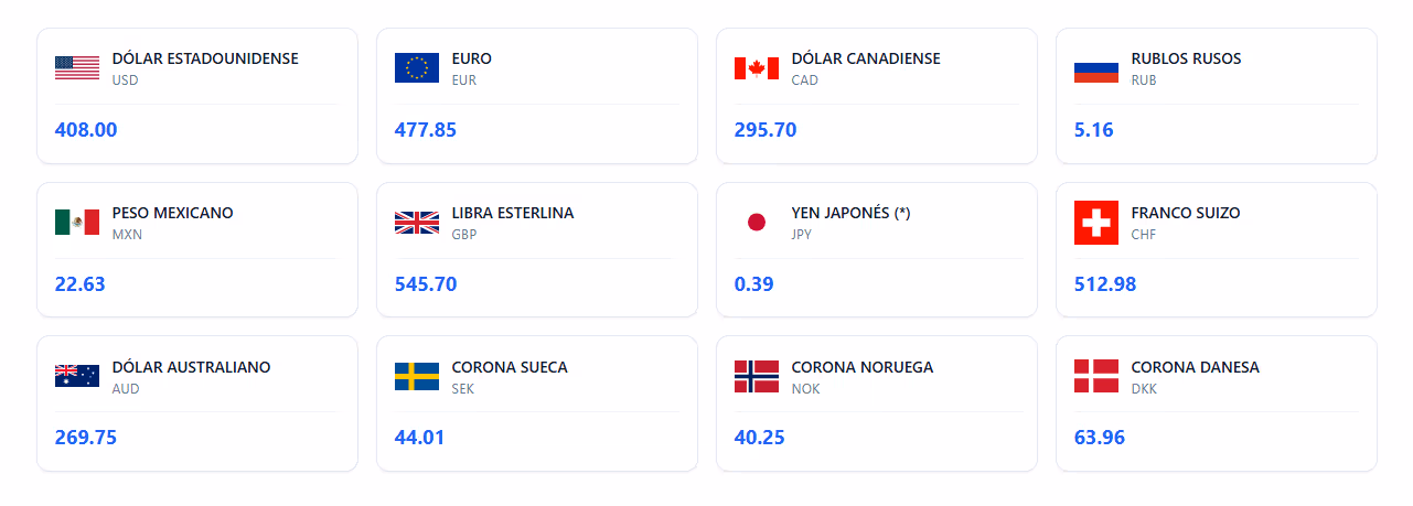 Según la información oficial, el dólar estadounidense se cotiza hoy a 408 CUP, mientras que el euro alcanza los 477.85 CUP. La libra esterlina se sitúa en 545.70 CUP, el franco suizo en 512.98 CUP y el dólar canadiense en 295.70 CUP. Otras monedas también mantienen valores elevados: el dólar australiano marca 269.75 CUP, la corona danesa 63.96 CUP, la corona sueca 44.01 CUP y la corona noruega 40.25 CUP.