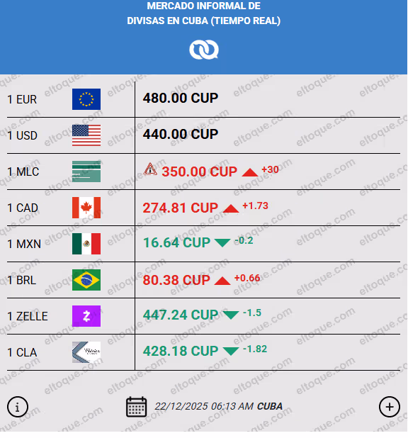 En paralelo, los valores representativos del mercado informal de divisas en Cuba se mantienen prácticamente inamovibles. De acuerdo con las tasas de referencia más recientes, el dólar estadounidense continúa en 440 CUP y el euro en 480 CUP. La Moneda Libremente Convertible sube hasta los 350 CUP, con un incremento puntual, mientras que el dólar canadiense ronda los 274.81 CUP.