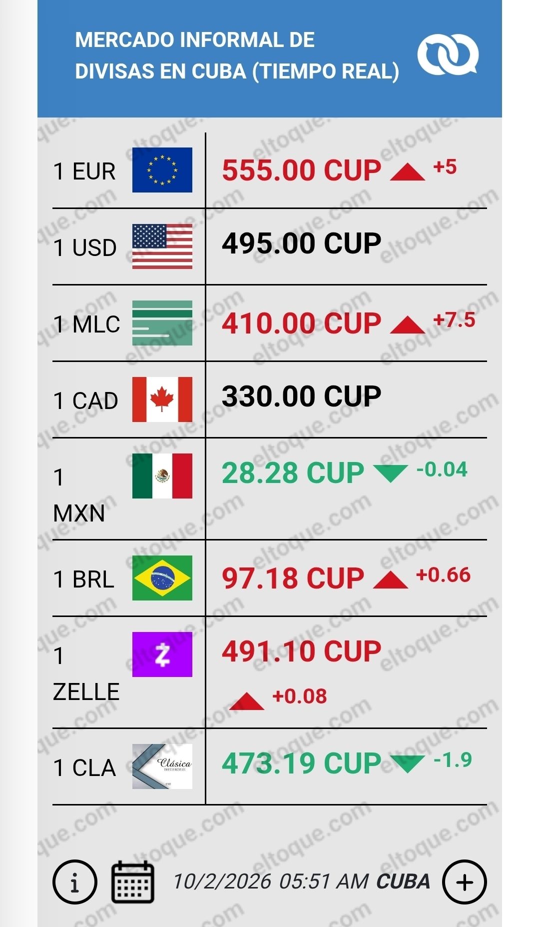 El dólar se cotiza en 495 pesos cubanos, el euro alcanza los 555 pesos cubanos y la moneda libremente convertible se mantiene en torno a los 410 pesos cubanos.