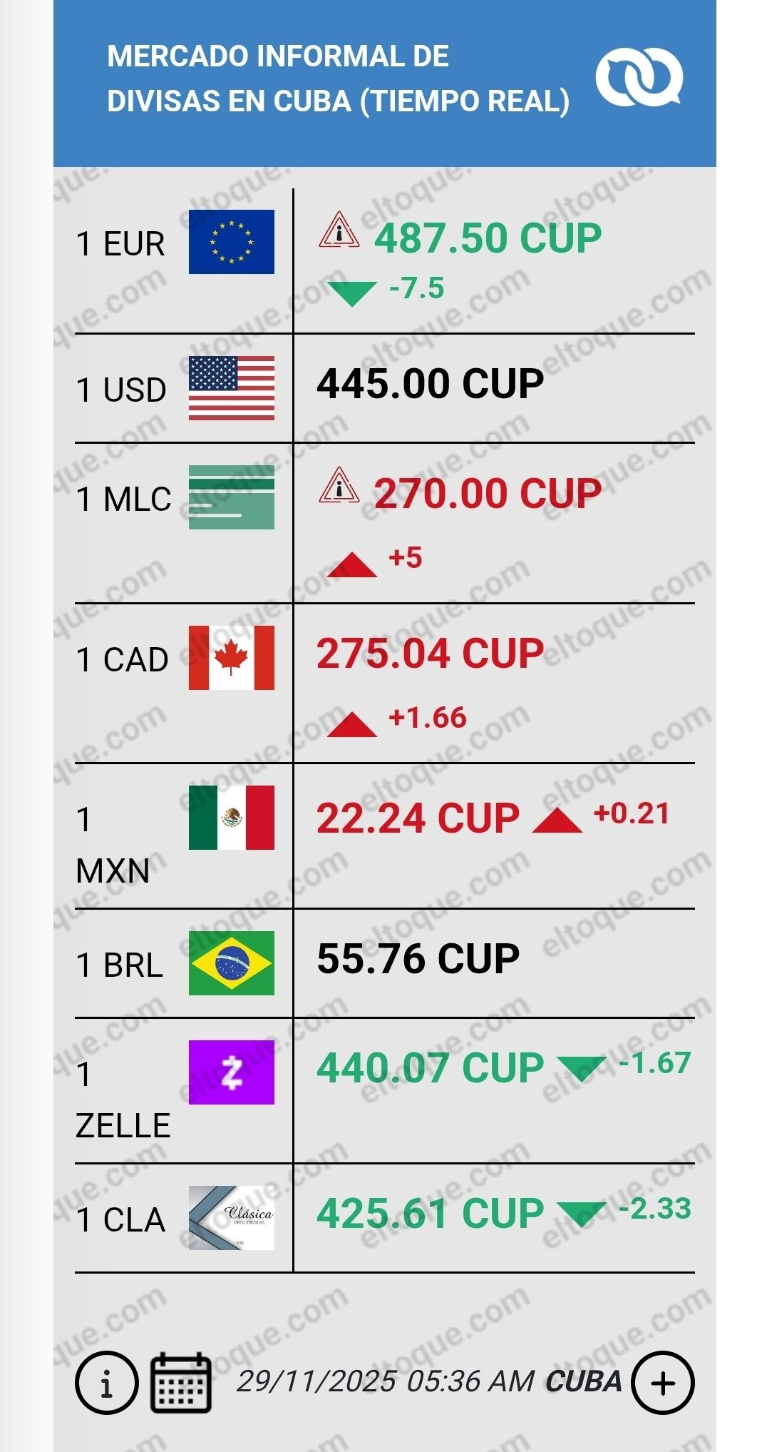 El MLC sube a 270 pesos, con un alza de cinco pesos. El dólar por Zelle cae ligeramente hasta 440.07 pesos.