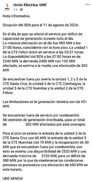 Actualmente, se encuentran fuera de servicio por averías las unidades 1, 2 y 3 de la CTE Santa Cruz, la unidad 4 de la CTE Cienfuegos, la unidad 5 de la CTE Nuevitas y la unidad 2 de la CTE Felton. Además, las limitaciones en la generación térmica ascienden a 431 MW.