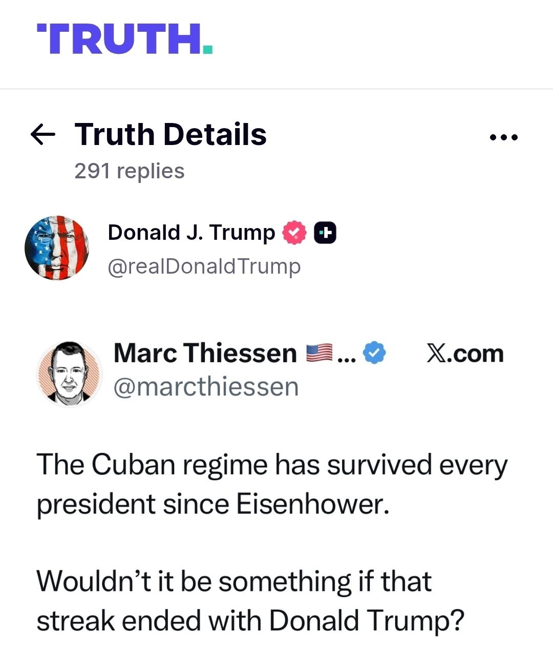 El contenido republicado por Trump pertenece al analista Marc Thiessen. En el texto se afirma que el régimen cubano ha sobrevivido a todas las administraciones estadounidenses desde la presidencia de Dwight D. Eisenhower y se plantea si no sería “hermoso” que esa racha se rompiera con Donald Trump.