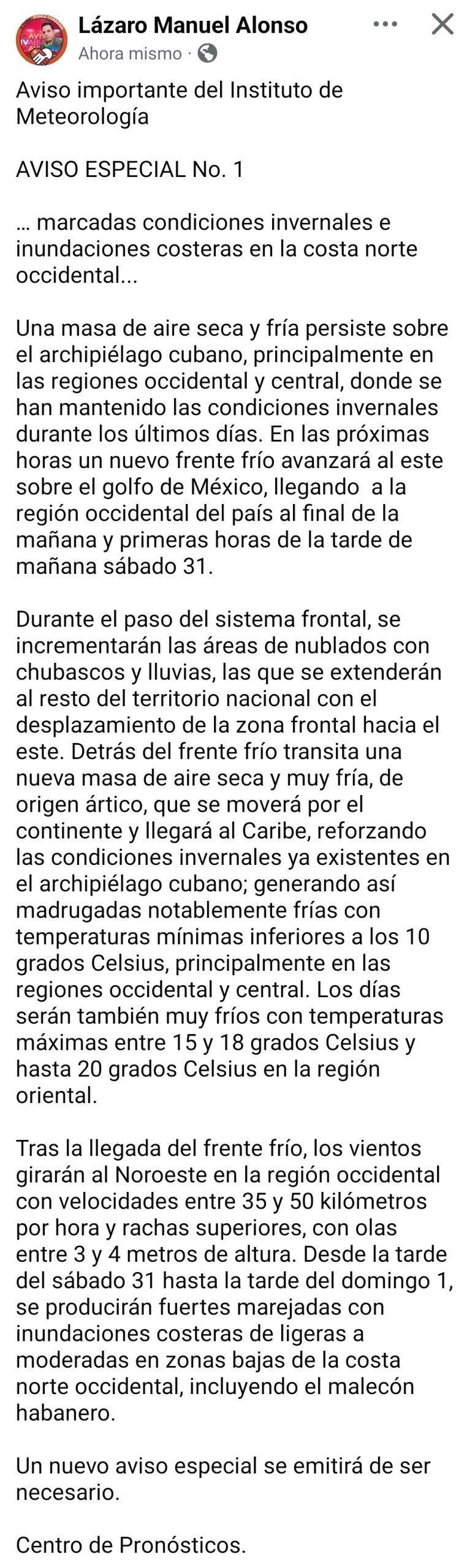 El Instituto de Meteorología indicó que se emitirá un nuevo aviso especial en caso de ser necesario, en dependencia de la evolución de las condiciones meteorológicas.