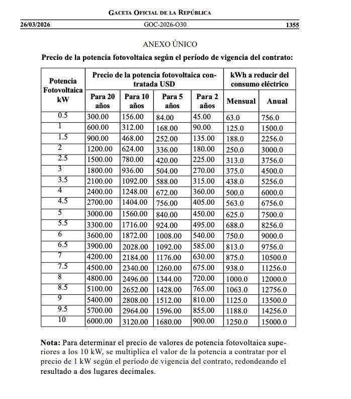 El documento incluye una tabla oficial con los valores de la potencia fotovoltaica. Los precios están expresados en dólares estadounidenses .