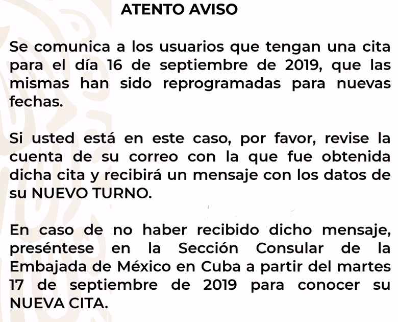 “En caso de no haber recibido dicho mensaje, preséntese en la Sección Consular de Embajada de México en Cuba partir del martes 17 de septiembre de 2019 para conocer los datos referidos a su NUEVA CITA”.