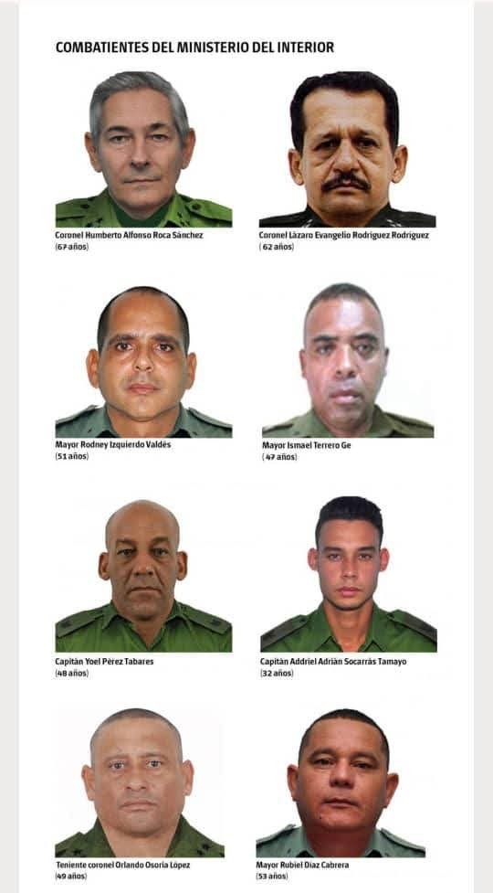 Otro bloque de fallecidos pertenecía al Ministerio del Interior de Cuba. En ese apartado aparecen el coronel Humberto Alfonso Roca Sánchez y el coronel Lázaro Evangelio Rodríguez Rodríguez. También se identificó al mayor Rodney Izquierdo Valdés y al mayor Ismael Terrero Ge.