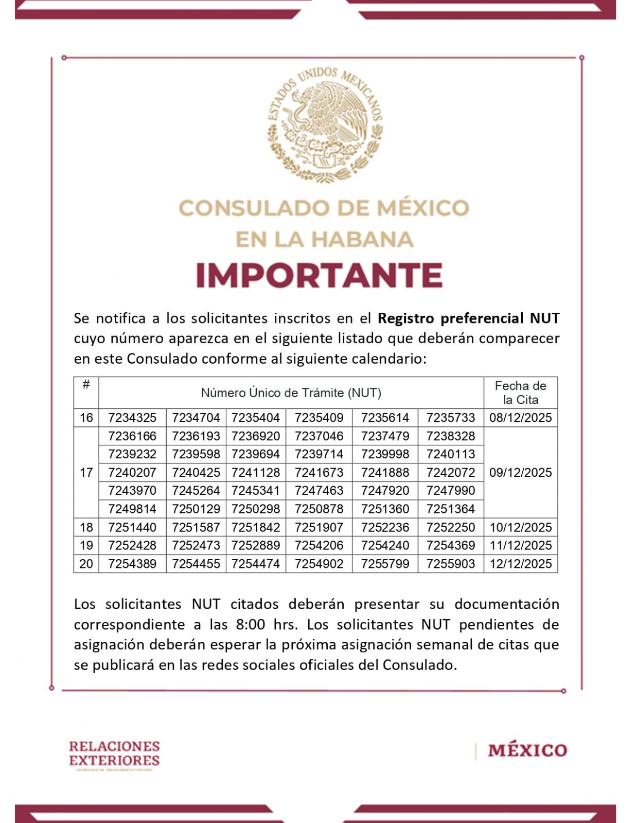 Regístrese y manténgase atento: aquí se publicarán las asignaciones. pic.twitter.com/4RdiRcnpH0— Consulado de México en La Habana (@ConsulMexLH) November 28, 2025