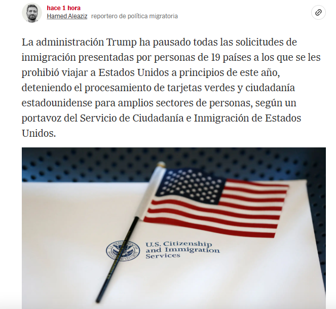 Fuentes citadas por ABC News y The New York Times confirmaron que USCIS suspendió ceremonias de naturalización programadas para esta misma semana. Los casos corresponden a ciudadanos de Cuba, Venezuela, Irán y Afganistán, incluidos en la nueva lista de prohibición de viajes.