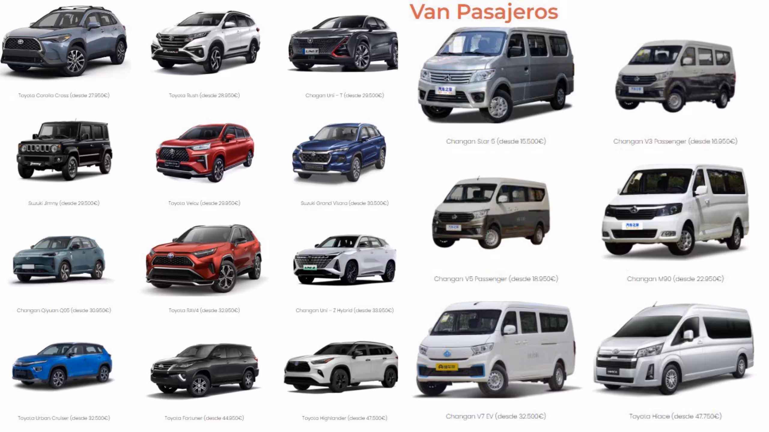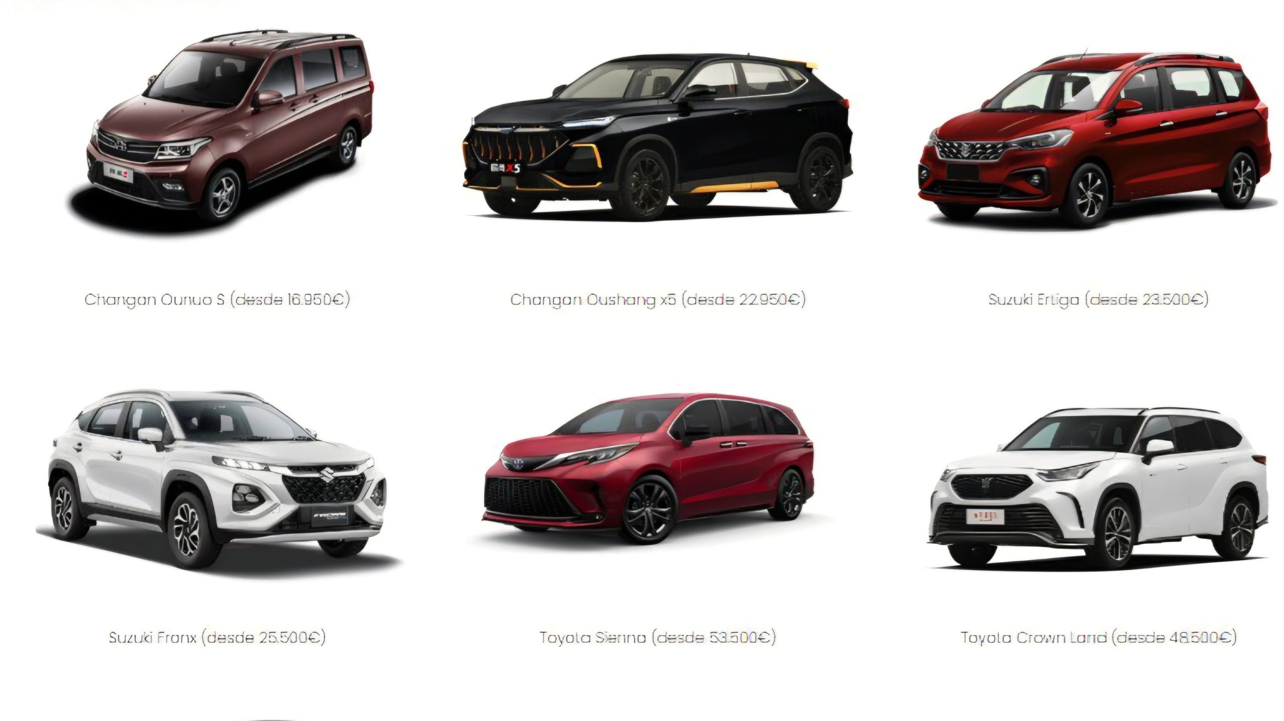 Otros modelos destacados incluyen el Suzuki Jimny en 29 500 euros, el Toyota Veloz en 29 950 euros y el Grand Vitara en 30 500 euros.