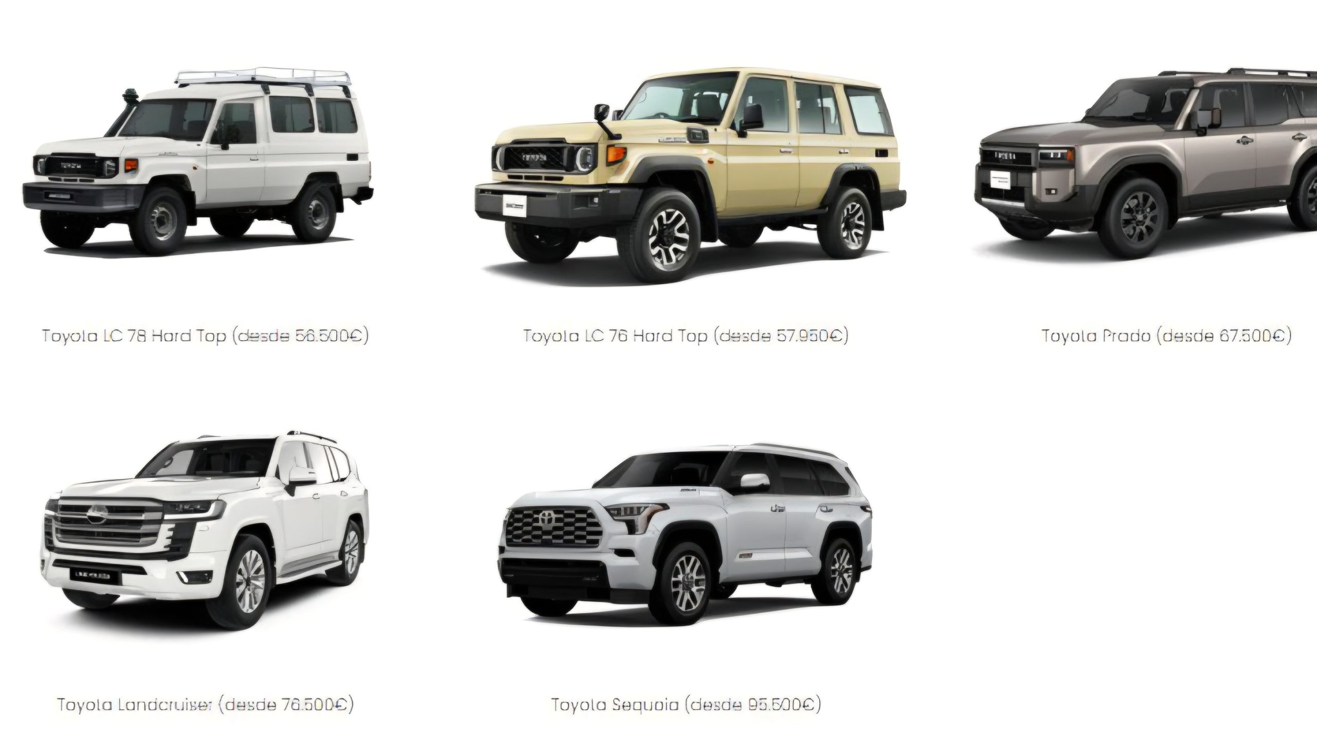 En Toyota, la Hilux tiene un precio de 39 500 euros. Las versiones LC 79 se sitúan entre 49 500 y 52 500 euros, mientras que la Toyota Tundra alcanza los 72 500 euros.