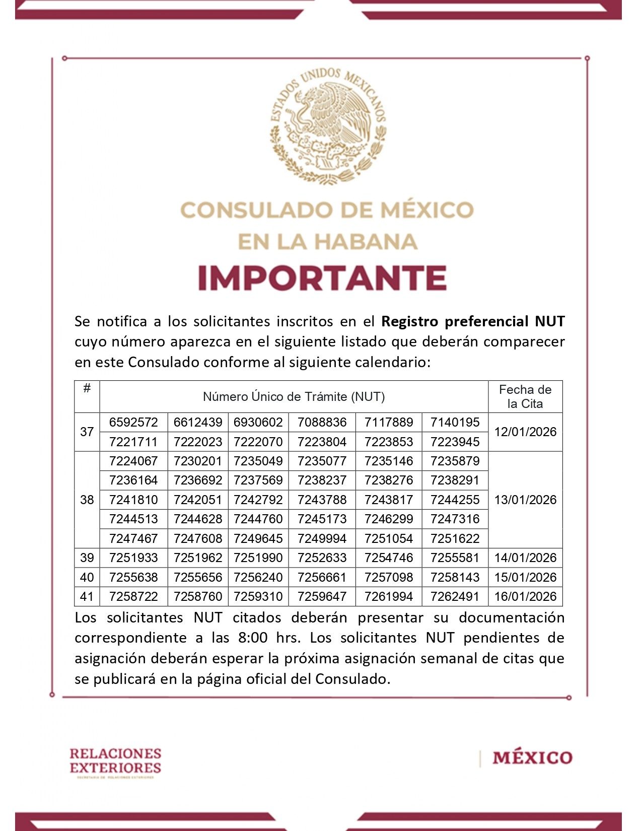El Consulado de México en La Habana informó sobre la asignación de citas preferenciales para solicitantes inscritos en el Registro NUT. El aviso corresponde a la segunda semana del año 2026 y detalla fechas y condiciones para comparecer.