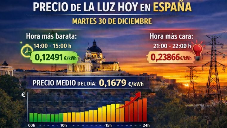 El precio de la luz registra este martes 30 de diciembre un cambio relevante en España, con una bajada del coste medio diario y una diferencia clara entre las horas más baratas del día y los tramos más caros de la noche. La jornada ofrece varias ventanas favorables para el consumo doméstico, especialmente en horas centrales.