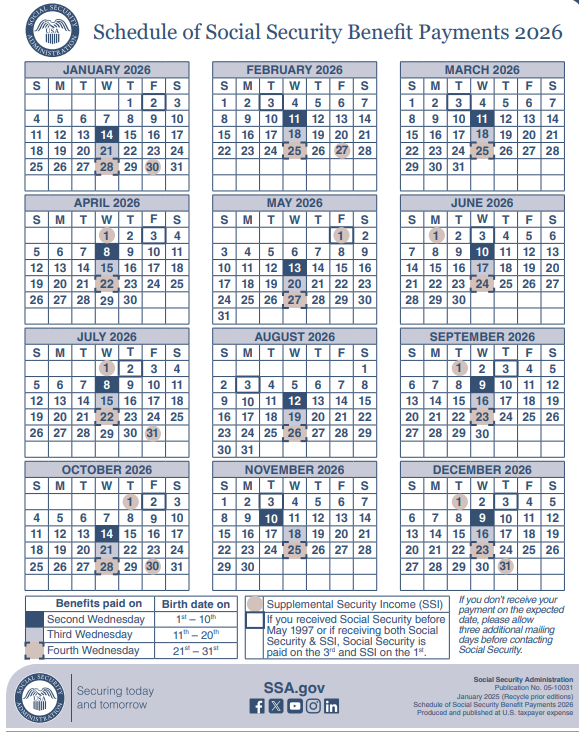 La SSA ya confirmó el calendario oficial de pagos correspondiente a enero de 2026. Las fechas incluyen el impacto directo del nuevo Ajuste por Costo de Vida del 2.8 por ciento (), aprobado para el próximo año.