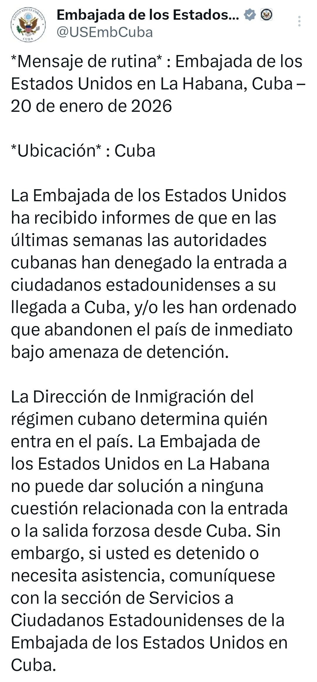 En caso de necesitar asistencia, la embajada indica que debe contactarse con la Sección de Servicios a Ciudadanos Estadounidenses en La Habana.