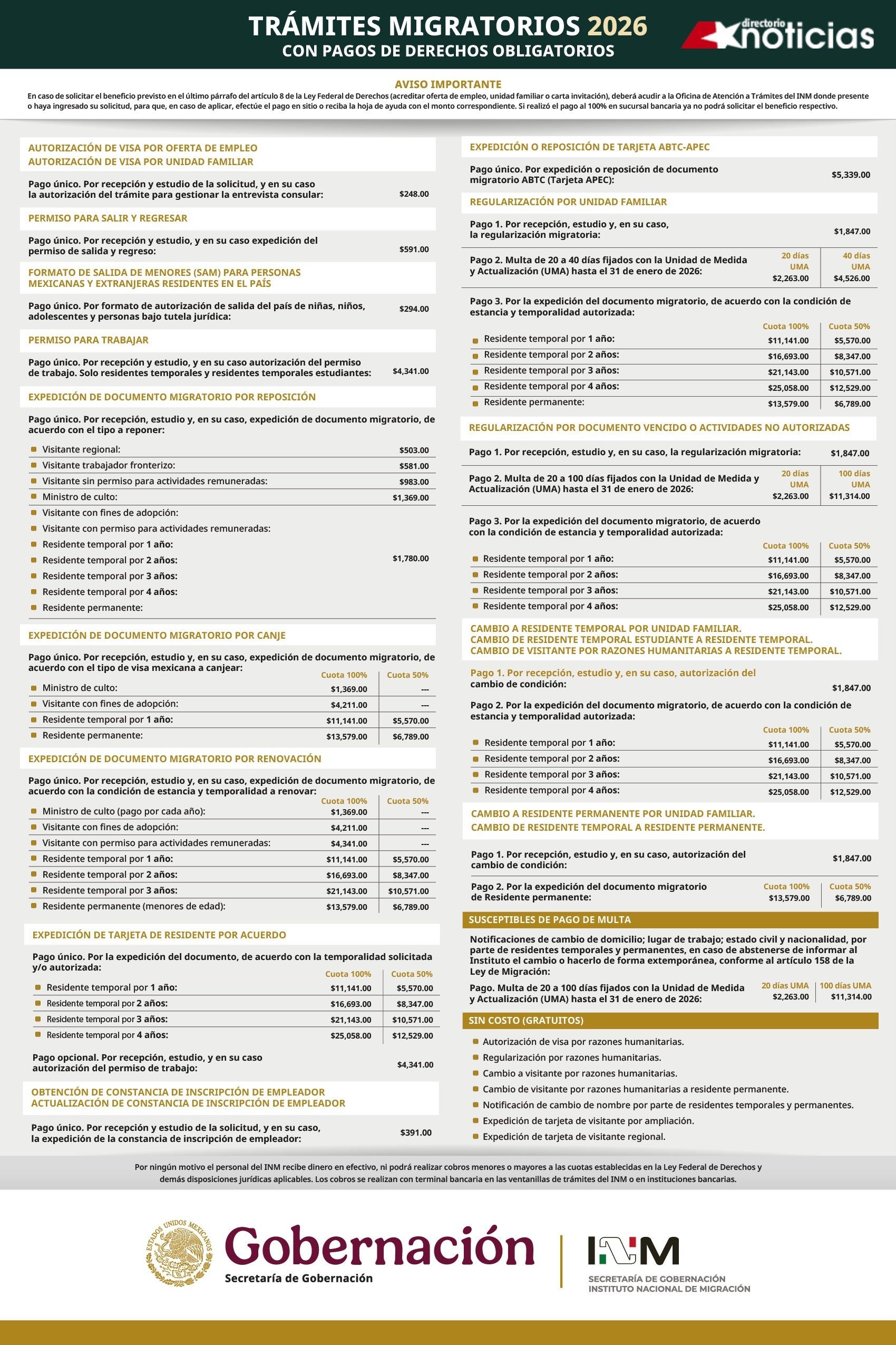 El Instituto Nacional de Migración confirmó los nuevos montos que deberán pagarse por trámites migratorios a partir del 1 de enero de 2026.