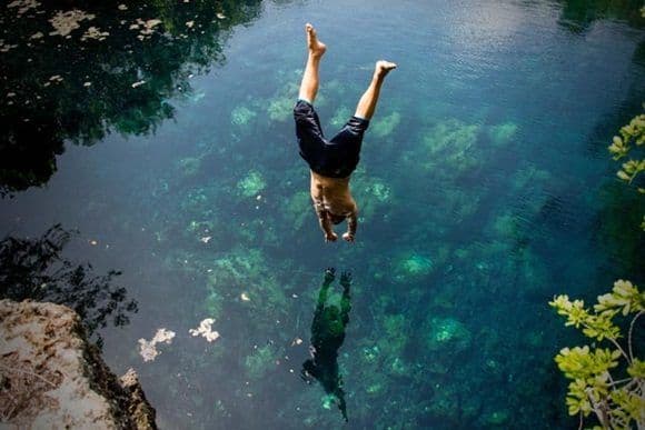 La mayor atracción turística es el propio acceso a la gruta, mediante una dolina o cenote de 30 metros de largo por 15 de ancho y 7 de profundidad, de aguas transparentes y reflejo azulado que da origen a su nombre.