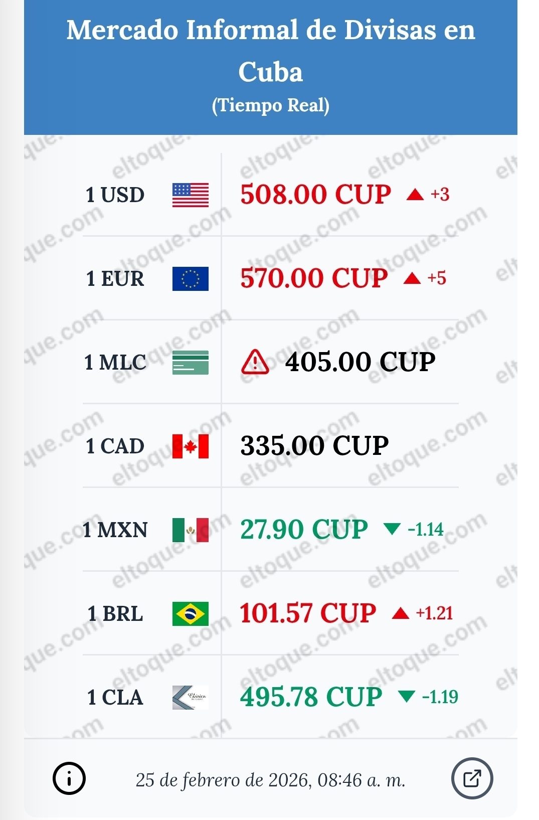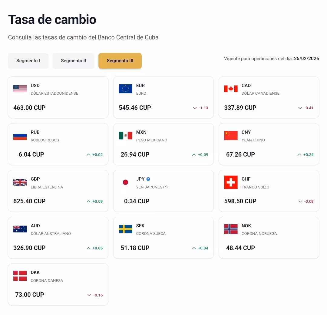 En el mercado oficial (Segmento III del BCC), vigente para operaciones del día 25/02/2026, el dólar estadounidense (USD) se mantiene en 463.00 CUP, sin variación respecto a la jornada previa. El euro (EUR) cotiza en 545.46 CUP, con una ligera caída de -1.13 CUP, lo que indica una corrección a la baja en las últimas 24 horas.