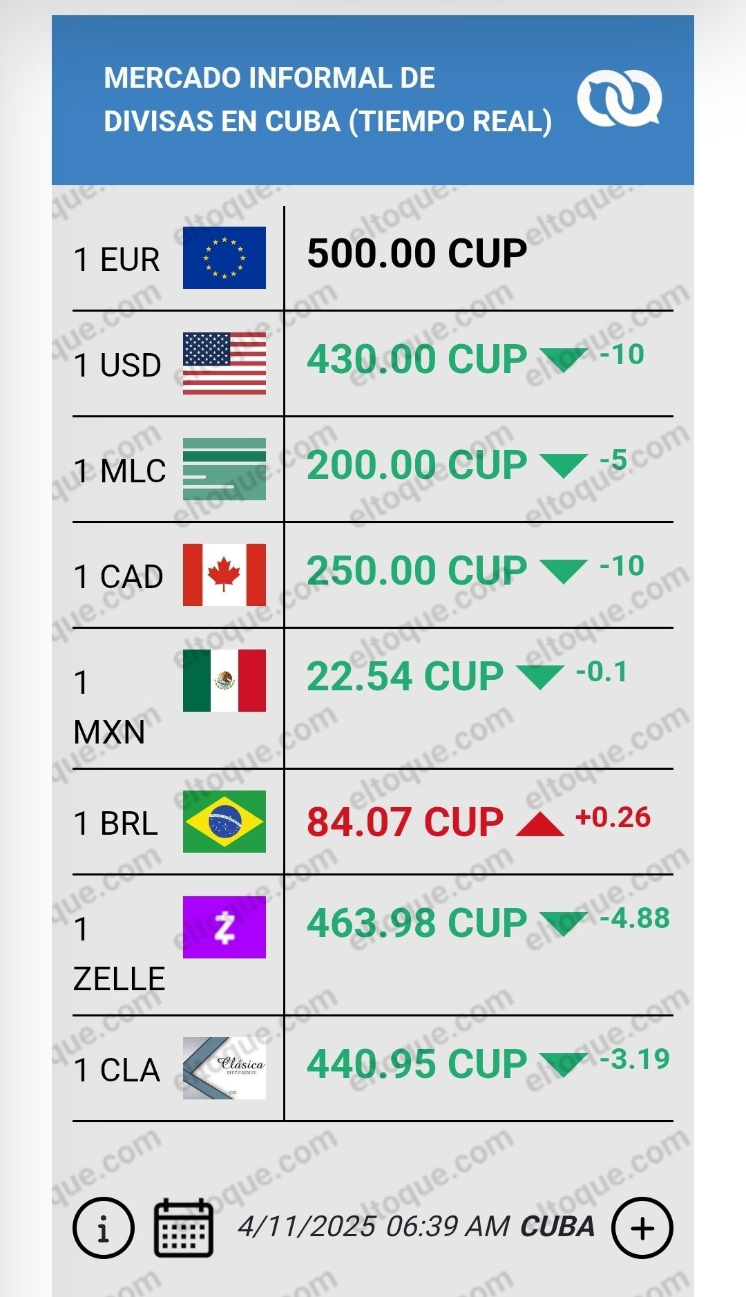 El dólar estadounidense (USD) bajó 10 pesos, situándose en 430.00 CUP. Las equivalencias son: